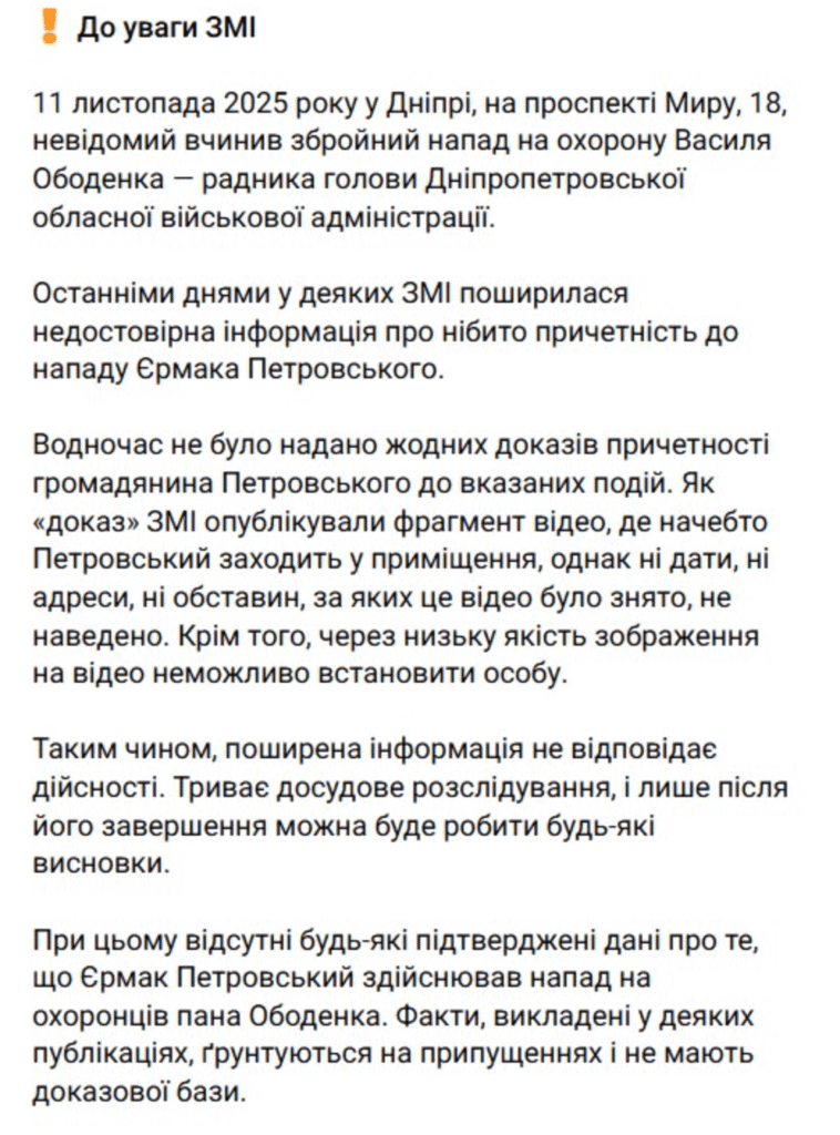 Йдеться про інцидент, що стався 11 листопада 2025 року на проспекті Миру, де невідомий вчинив збройний напад на охорону радника голови Дніпропетровської ОВА Василя Ободенка. Один з охоронців отримав вісім кульових поранень та був госпіталізований.