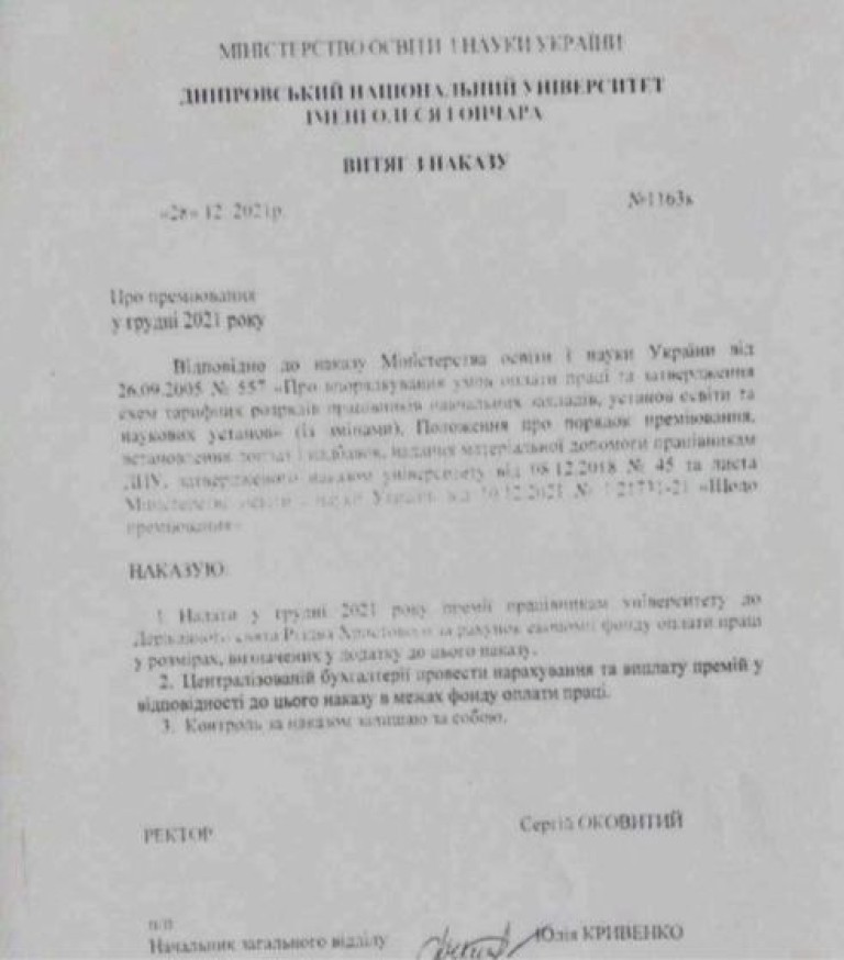 З цієї суми 1,3 млн грн за рішенням ректора Сергія Оковитого у грудні 2021 року виплатити в якості премій. Але замість власних доходів для цього використали державні гроші. Одним з тих, хто перед Новим роком отримав премію був ректор Сергій Оковитий.