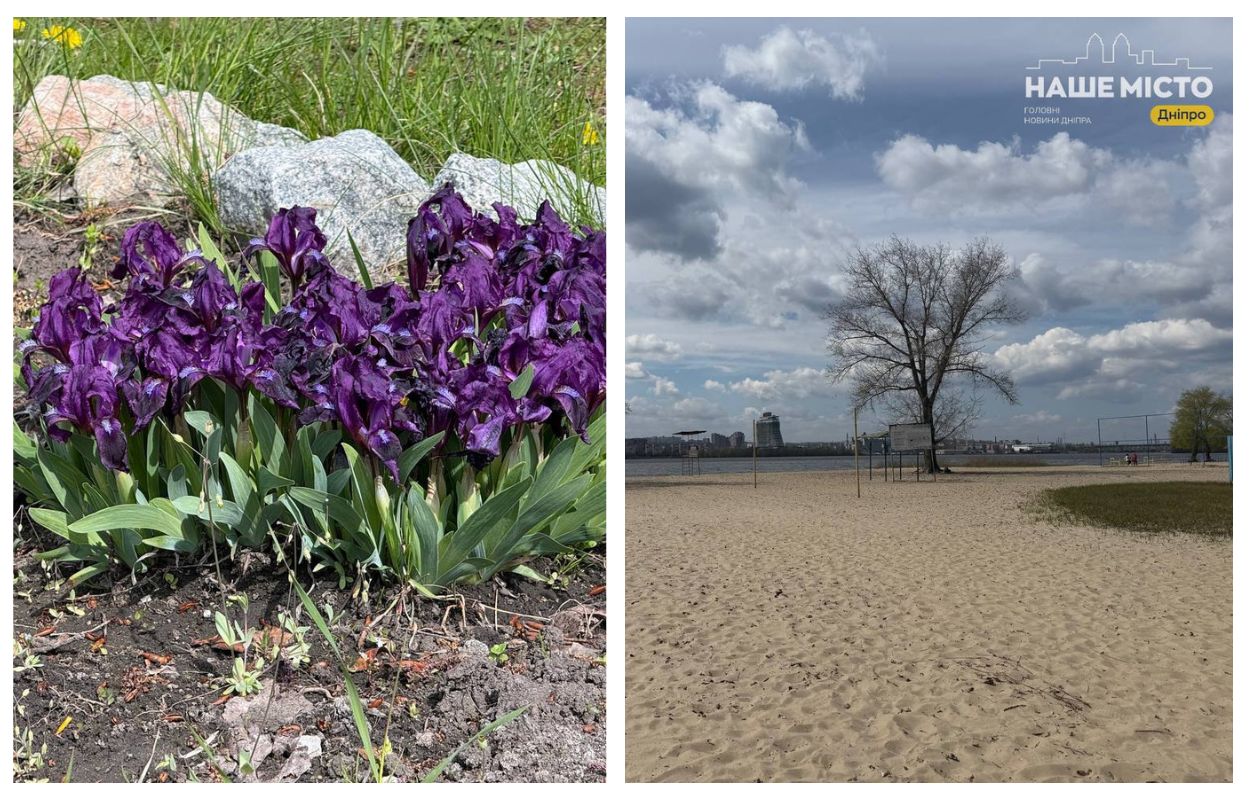 - гальковий пляж на березі Дніпра з гарними краєвидами на місто.